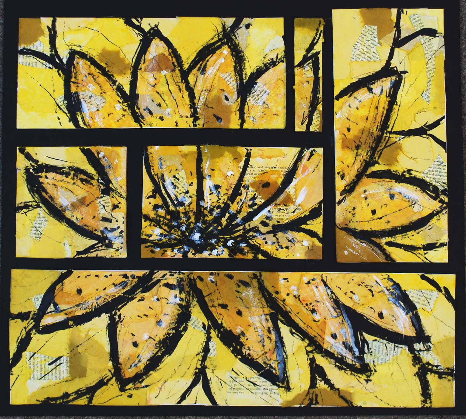This was my first attempt at a polyptych, I used my unique style of creating the background by using found papers and then doing a color wash on top. I used india ink in this piece to draw the flower. I used a stick dipped in the india ink to draw with. I then went in with white acrylic paint to add some contrast and highlights. I like this piece, it reflects my happy personality. I enjoyed making this a polyptych piece, i think it adds interest.